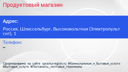 Продуктовый магазин по адресу Высоковольтная улица, садоводческий массив "Дунай", Морозовское городское поселение, Всеволожский район, Ленинградская область, Северо-Западный федеральный округ, Россия в дальнейшем Организация, размещена в следующих категориях: