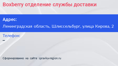 Boxberry, отделение службы доставки по адресу Ленинградская область, Шлиссельбург, улица Кирова, 2 в дальнейшем Организация, размещена в следующих категориях: