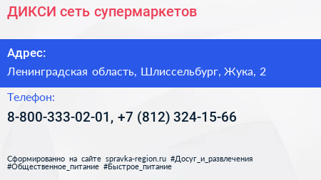 ДИКСИ, сеть супермаркетов по адресу Ленинградская область, Шлиссельбург, Жука, 2 в дальнейшем Организация, размещена в следующих категориях: