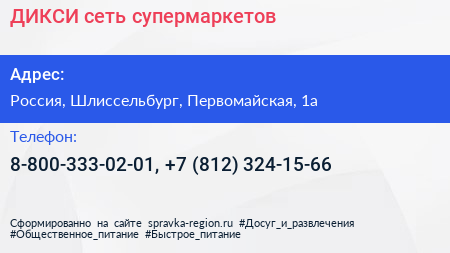 ДИКСИ, сеть супермаркетов по адресу 1, Первомайская улица, посёлок имени Морозова, Морозовское городское поселение, Всеволожский район, Ленинградская область, Северо-Западный федеральный округ, 188679, Россия в дальнейшем Организация, размещена в следующих категориях: