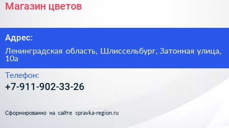 Магазин цветов по адресу Ленинградская область, Шлиссельбург, Затонная улица, 10а в дальнейшем Организация, размещена в следующих категориях:
