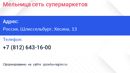 Мельница, сеть супермаркетов по адресу 13, улица Хесина, посёлок имени Морозова, Морозовское городское поселение, Всеволожский район, Ленинградская область, Северо-Западный федеральный округ, 188679, Россия в дальнейшем Организация, размещена в следующих категориях: