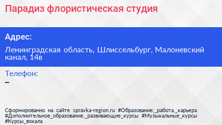 Парадиз, флористическая студия по адресу Ленинградская область, Шлиссельбург, Малоневский канал, 14в в дальнейшем Организация, размещена в следующих категориях: