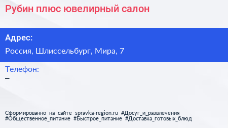 Рубин плюс, ювелирный салон по адресу ТРК Морозовский, 7, улица Мира, посёлок имени Морозова, Морозовское городское поселение, Всеволожский район, Ленинградская область, Северо-Западный федеральный округ, 188679, Россия в дальнейшем Организация, размещена в следующих категориях: