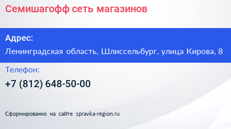 Семишагофф, сеть магазинов по адресу Ленинградская область, Шлиссельбург, улица Кирова, 8 в дальнейшем Организация, размещена в следующих категориях: