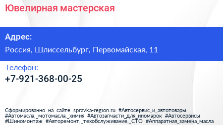 Ювелирная мастерская по адресу 11, Первомайская улица, посёлок имени Морозова, Морозовское городское поселение, Всеволожский район, Ленинградская область, Северо-Западный федеральный округ, 188679, Россия в дальнейшем Организация, размещена в следующих категориях: