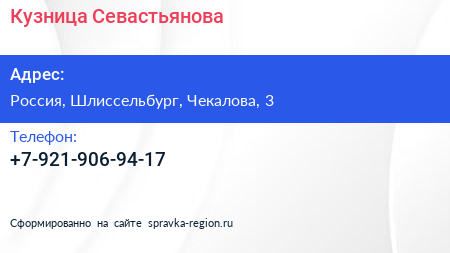 Кузница Севастьянова по адресу Специальная пожарная часть № 6, 41К-070, посёлок имени Морозова, Морозовское городское поселение, Всеволожский район, Ленинградская область, Северо-Западный федеральный округ, 188679, Россия в дальнейшем Организация, размещена в следующих категориях: