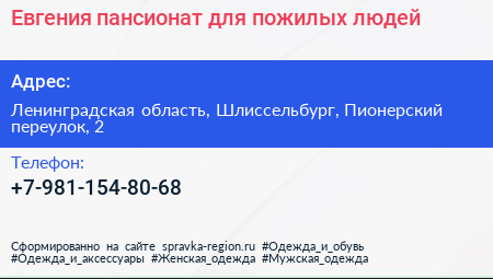Евгения, пансионат для пожилых людей по адресу Ленинградская область, Шлиссельбург, Пионерский переулок, 2 в дальнейшем Организация, размещена в следующих категориях: