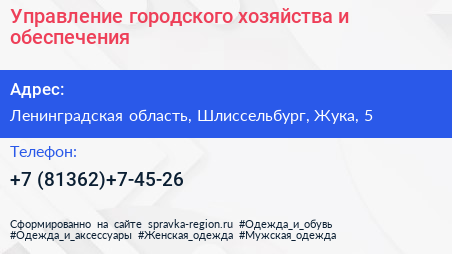 Управление городского хозяйства и обеспечения по адресу Ленинградская область, Шлиссельбург, Жука, 5 в дальнейшем Организация, размещена в следующих категориях: