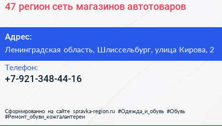 47 регион, сеть магазинов автотоваров по адресу Ленинградская область, Шлиссельбург, улица Кирова, 2 в дальнейшем Организация, размещена в следующих категориях: