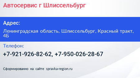 Автосервис, г. Шлиссельбург по адресу Ленинградская область, Шлиссельбург, Красный тракт, 4Б в дальнейшем Организация, размещена в следующих категориях: