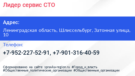Лидер-сервис, СТО по адресу Ленинградская область, Шлиссельбург, Затонная улица, 10 в дальнейшем Организация, размещена в следующих категориях: