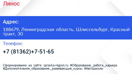 Линос по адресу 188679, Ленинградская область, Шлиссельбург, Красный тракт, 30 в дальнейшем Организация, размещена в следующих категориях: