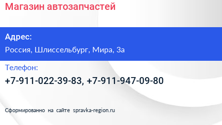Магазин автозапчастей по адресу 3А, улица Мира, посёлок имени Морозова, Морозовское городское поселение, Всеволожский район, Ленинградская область, Северо-Западный федеральный округ, 188679, Россия в дальнейшем Организация, размещена в следующих категориях: