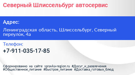 Северный Шлиссельбург, автосервис по адресу Ленинградская область, Шлиссельбург, Северный переулок, 4а в дальнейшем Организация, размещена в следующих категориях: