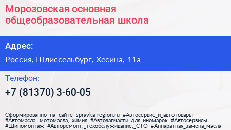 Морозовская основная общеобразовательная школа по адресу 11, улица Хесина, посёлок имени Морозова, Морозовское городское поселение, Всеволожский район, Ленинградская область, Северо-Западный федеральный округ, 188679, Россия в дальнейшем Организация, размещена в следующих категориях:
