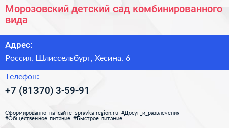 Морозовский детский сад комбинированного вида по адресу Морозовский детский сад, Ладожская улица, посёлок имени Морозова, Морозовское городское поселение, Всеволожский район, Ленинградская область, Северо-Западный федеральный округ, 188679, Россия в дальнейшем Организация, размещена в следующих категориях: