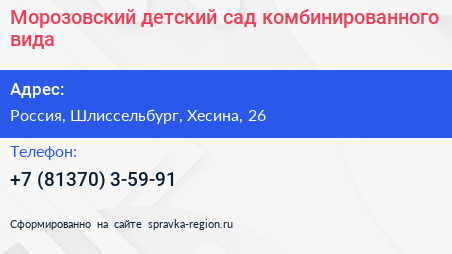 Морозовский детский сад комбинированного вида по адресу 26, улица Хесина, посёлок имени Морозова, Морозовское городское поселение, Всеволожский район, Ленинградская область, Северо-Западный федеральный округ, 188679, Россия в дальнейшем Организация, размещена в следующих категориях: