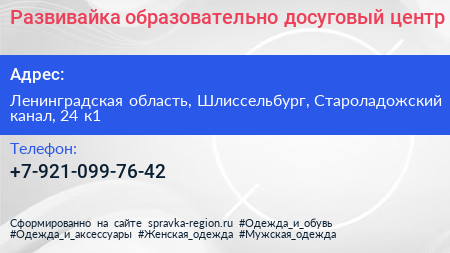 Развивайка, образовательно-досуговый центр по адресу Ленинградская область, Шлиссельбург, Староладожский канал, 24 к1 в дальнейшем Организация, размещена в следующих категориях: