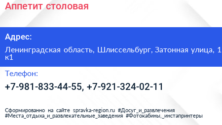 Аппетит, столовая по адресу Ленинградская область, Шлиссельбург, Затонная улица, 1 к1 в дальнейшем Организация, размещена в следующих категориях: