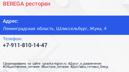 BEREGA, ресторан по адресу Ленинградская область, Шлиссельбург, Жука, 4 в дальнейшем Организация, размещена в следующих категориях: