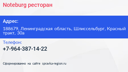 Noteburg, ресторан по адресу 188679, Ленинградская область, Шлиссельбург, Красный тракт, 30а в дальнейшем Организация, размещена в следующих категориях: