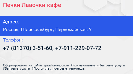 Печки-Лавочки, кафе по адресу 9, Первомайская улица, посёлок имени Морозова, Морозовское городское поселение, Всеволожский район, Ленинградская область, Северо-Западный федеральный округ, 188679, Россия в дальнейшем Организация, размещена в следующих категориях: