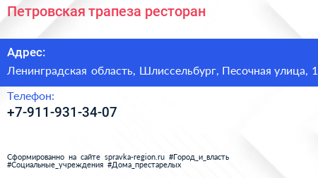 Петровская трапеза, ресторан по адресу Ленинградская область, Шлиссельбург, Песочная улица, 1 в дальнейшем Организация, размещена в следующих категориях: