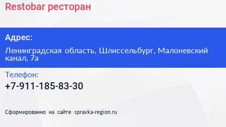 Restobar, ресторан по адресу Ленинградская область, Шлиссельбург, Малоневский канал, 7а в дальнейшем Организация, размещена в следующих категориях: