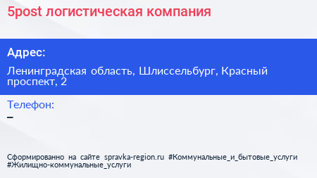 5post, логистическая компания по адресу Ленинградская область, Шлиссельбург, Красный проспект, 2 в дальнейшем Организация, размещена в следующих категориях: