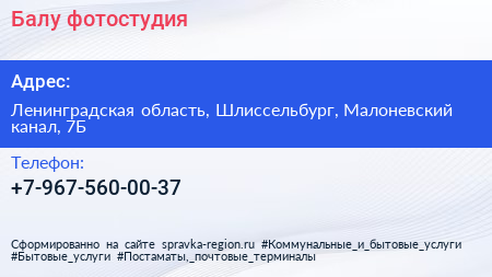 Балу, фотостудия по адресу Ленинградская область, Шлиссельбург, Малоневский канал, 7Б в дальнейшем Организация, размещена в следующих категориях:
