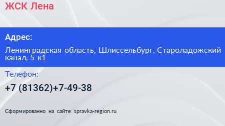 ЖСК Лена по адресу Ленинградская область, Шлиссельбург, Староладожский канал, 5 к1 в дальнейшем Организация, размещена в следующих категориях: