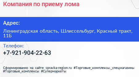 Компания по приему лома по адресу Ленинградская область, Шлиссельбург, Красный тракт, 11Б в дальнейшем Организация, размещена в следующих категориях: