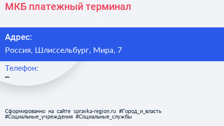 МКБ, платежный терминал по адресу ТРК Морозовский, 7, улица Мира, посёлок имени Морозова, Морозовское городское поселение, Всеволожский район, Ленинградская область, Северо-Западный федеральный округ, 188679, Россия в дальнейшем Организация, размещена в следующих категориях: