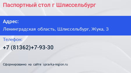 Паспортный стол, г. Шлиссельбург по адресу Ленинградская область, Шлиссельбург, Жука, 3 в дальнейшем Организация, размещена в следующих категориях: