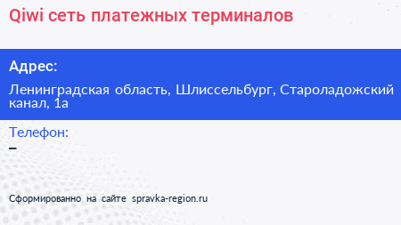 Qiwi, сеть платежных терминалов по адресу Ленинградская область, Шлиссельбург, Староладожский канал, 1а в дальнейшем Организация, размещена в следующих категориях: