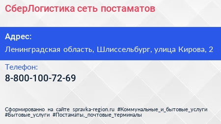 СберЛогистика, сеть постаматов по адресу Ленинградская область, Шлиссельбург, улица Кирова, 2 в дальнейшем Организация, размещена в следующих категориях:
