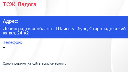 ТСЖ Ладoга по адресу Ленинградская область, Шлиссельбург, Староладожский канал, 24 к2 в дальнейшем Организация, размещена в следующих категориях: