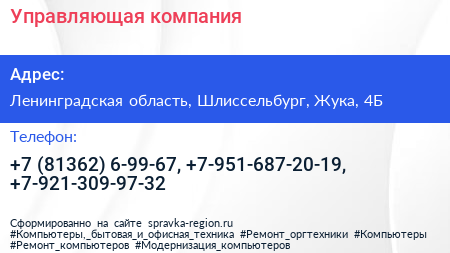 Управляющая компания по адресу Ленинградская область, Шлиссельбург, Жука, 4Б в дальнейшем Организация, размещена в следующих категориях: