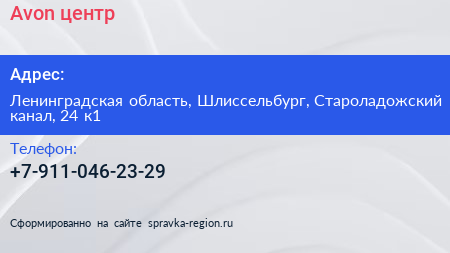 Avon, центр по адресу Ленинградская область, Шлиссельбург, Староладожский канал, 24 к1 в дальнейшем Организация, размещена в следующих категориях: