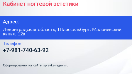 Кабинет ногтевой эстетики по адресу Ленинградская область, Шлиссельбург, Малоневский канал, 12а в дальнейшем Организация, размещена в следующих категориях: