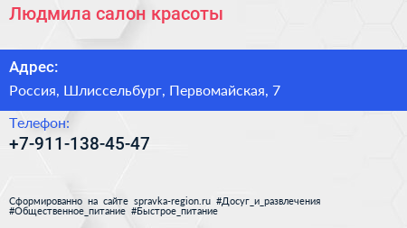 Людмила, салон красоты по адресу 7, Первомайская улица, посёлок имени Морозова, Морозовское городское поселение, Всеволожский район, Ленинградская область, Северо-Западный федеральный округ, 188679, Россия в дальнейшем Организация, размещена в следующих категориях: