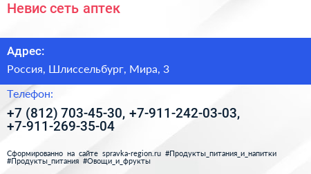 Невис, сеть аптек по адресу Магнит Косметик, 3, улица Мира, посёлок имени Морозова, Морозовское городское поселение, Всеволожский район, Ленинградская область, Северо-Западный федеральный округ, 188679, Россия в дальнейшем Организация, размещена в следующих категориях: