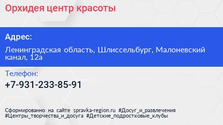 Орхидея, центр красоты по адресу Ленинградская область, Шлиссельбург, Малоневский канал, 12а в дальнейшем Организация, размещена в следующих категориях: