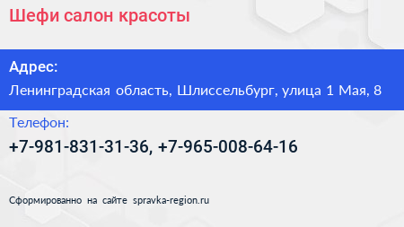 Шефи, салон красоты по адресу Ленинградская область, Шлиссельбург, улица 1 Мая, 8 в дальнейшем Организация, размещена в следующих категориях: