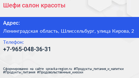 Шефи, салон красоты по адресу Ленинградская область, Шлиссельбург, улица Кирова, 2 в дальнейшем Организация, размещена в следующих категориях: