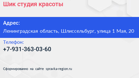 Шик, студия красоты по адресу Ленинградская область, Шлиссельбург, улица 1 Мая, 20 в дальнейшем Организация, размещена в следующих категориях: