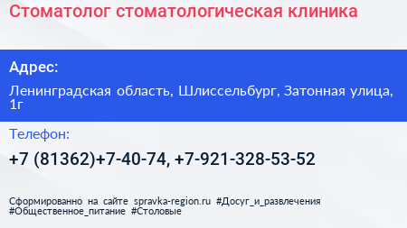 Стоматолог, стоматологическая клиника по адресу Ленинградская область, Шлиссельбург, Затонная улица, 1г в дальнейшем Организация, размещена в следующих категориях: