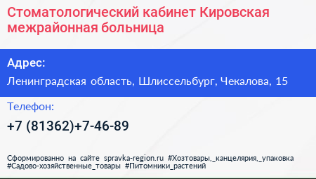 Стоматологический кабинет, Кировская межрайонная больница по адресу Ленинградская область, Шлиссельбург, Чекалова, 15 в дальнейшем Организация, размещена в следующих категориях: