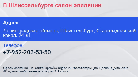 В Шлиссельбурге, салон эпиляции по адресу Ленинградская область, Шлиссельбург, Староладожский канал, 24 к1 в дальнейшем Организация, размещена в следующих категориях: